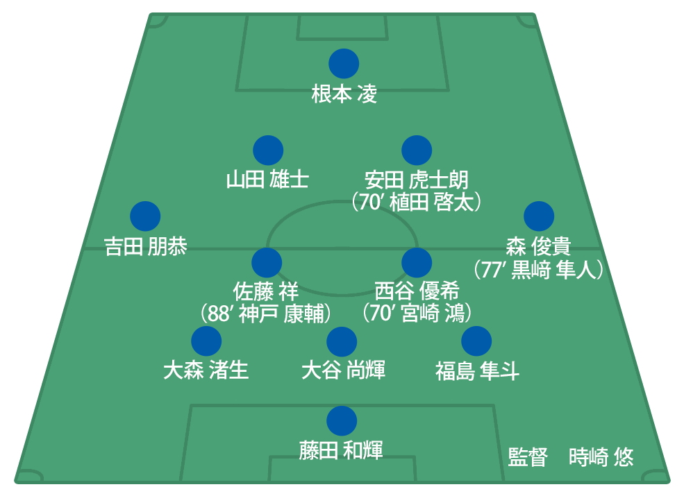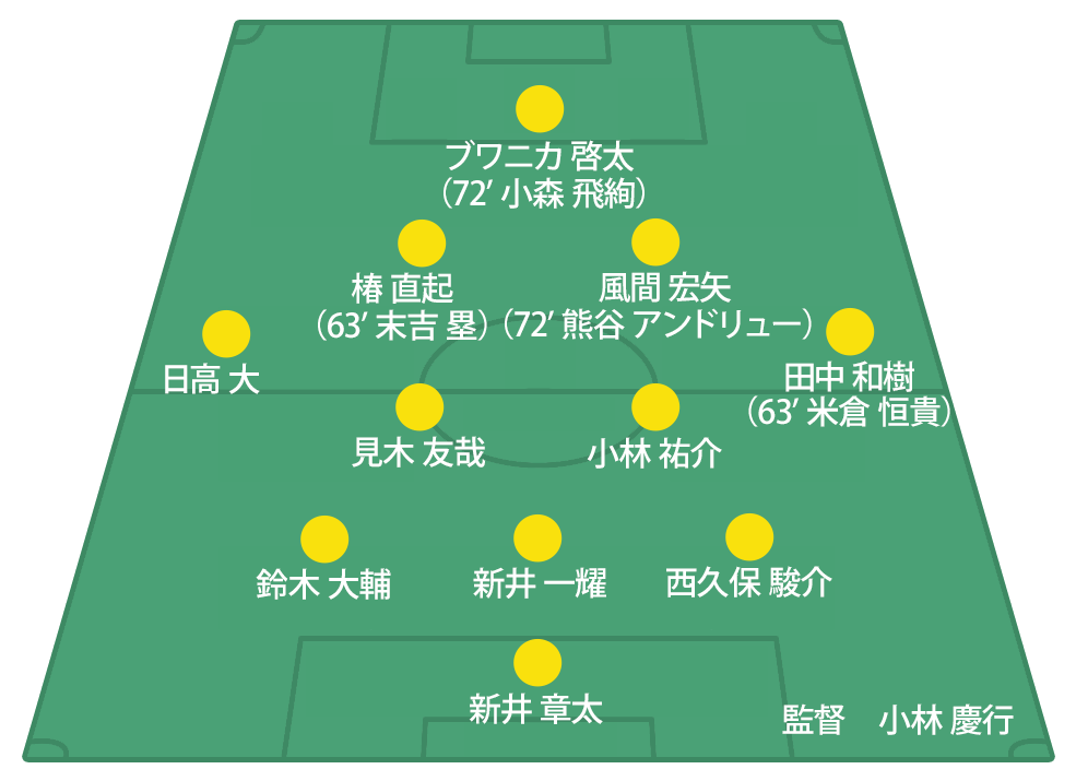 スタメンは4-4-2の布陣。GKは新井章太。最終ラインは右から西久保駿介、新井一耀、鈴木大輔、日高大の4人。中盤の底に小林祐介と見木友哉が並び、右サイドに風間宏矢、左サイドに椿直起が位置。2トップには小森飛絢とブワニカ啓太が入った。