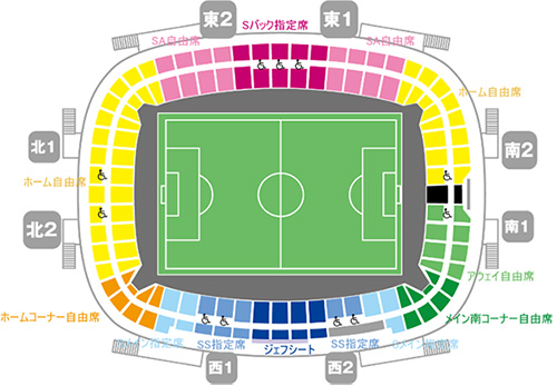 アウェイユニフォーム・グッズを着用しての通行・進入禁止とさせていただいているエリアにつきましては、ホーム自由席エリア(北側コンコース含む)・ホームコーナー自由席(コンコース含む)となっております。ホーム自由席・ホームコーナー自由席以外の席種につきましては、アウェイユニフォーム・グッズを着用してのご観戦は可能です。また、アウェイグッズを着用してご入場のお客様は南西ゲートからご入場ください。