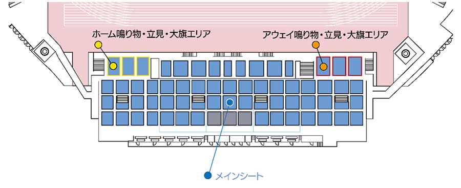 - 全席自由席となりますが、黄色の枠線で囲まれたエリアはホーム鳴り物・立見・大旗応援エリア、赤色の枠線で囲まれたエリアはアウェイ鳴り物・立見・大旗応援エリアとなります。