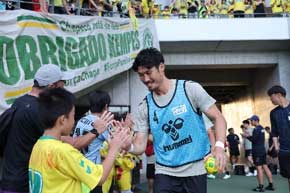 ピッチ内ウォーミングアップに向かう選手をハイタッチで送り出していただきます。