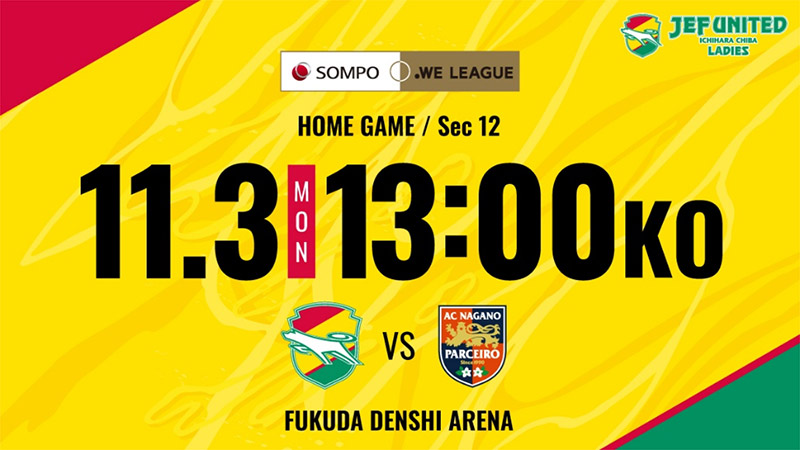 ジェフユナイテッド市原・千葉では、11月3日(月・祝)2025/26 SOMPO WEリーグ 第12節AC長野パルセイロ・レディース戦におきまして、以下の通りイベントを実施いたします。皆さまのご来場をお待ちしております!