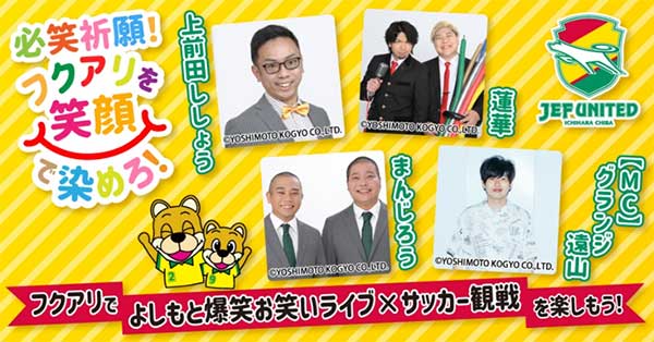 ジェフユナイテッド市原・千葉では、11月9日(日)2025明治安田J2リーグ第36節藤枝MYFC戦にて、よしもと芸人をお迎えして「よしもとお笑いライブ」を開催することとなりましたのでお知らせいたします。