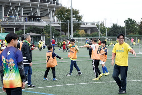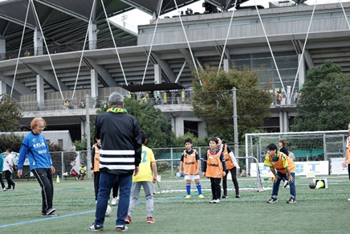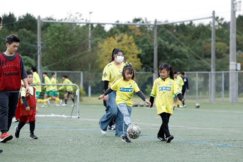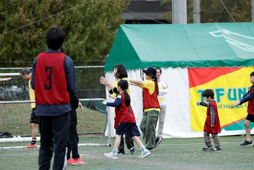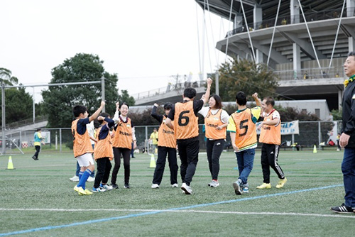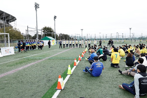 城西国際大学大学サッカー部当日は約100名の方にご参加いただき、幼児からシニアまで幅広い年代の方々が、健常者や障がいのある方が混ざったチームでウォーキングフットボールを楽しみました。