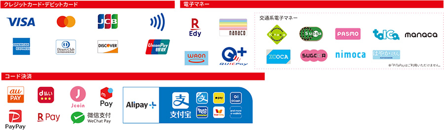 - お支払いは現金に加え、下記のキャッシュレス決済がご利用いただけます。