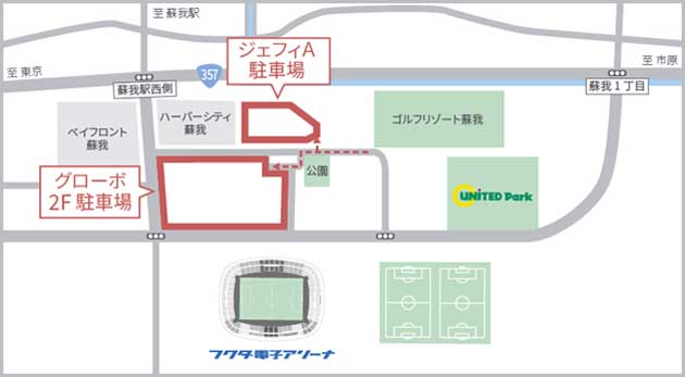 「ジェフィA駐車場」を当日販売いたします。駐車場の目印として、入口に黄色ののぼりを掲出しておりますので、そちらを目安にお越しください。のぼりが掲出されていない場合は満車となります。