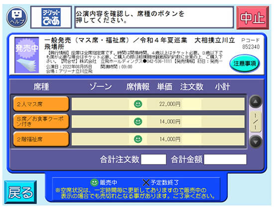 - 誤って連続していない席を購入した場合、チケットの変更、振替は行えませんので、ご注意ください。