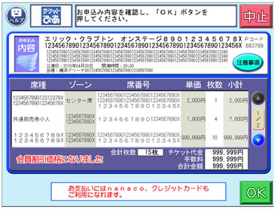 チケット代のほかに、発券手数料165円(税込)が購入枚数分にかかります。決済方法は、現金のほか、クレジットカード、nanaco支払いが可能です。