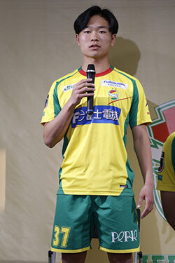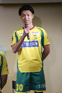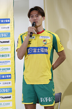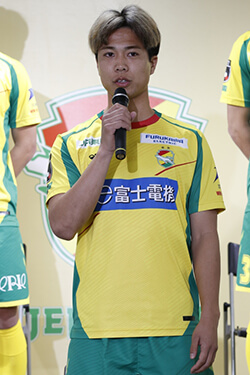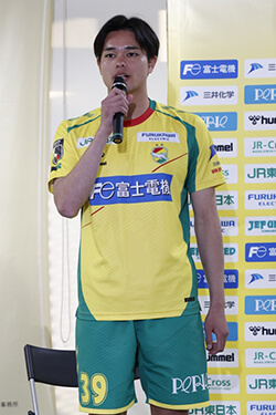 新加入の津久井匠海です。このクラブに加入できたことを嬉しく思います。自分の持ち味を全力で出して、皆さんに応援されるように全力でプレーするので、よろしくお願いします。