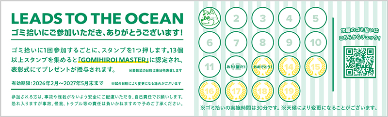 2026年2月~2027年6月末までの期間に、スタンプを13個以上集めた方は「GOMIHIROI MASTER」に認定されます。