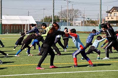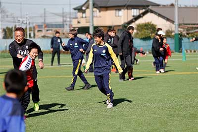 続いて、親子や選手と一緒にボールタッチやシュート練習を行い、いよいよお待ちかねの試合へ。