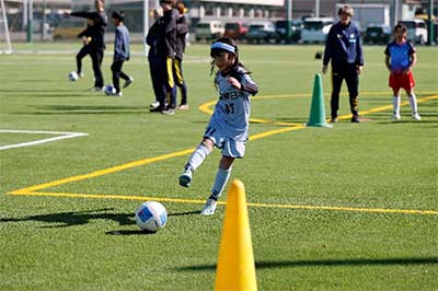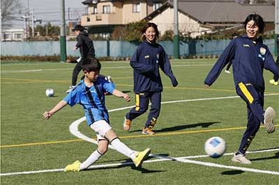 今回のサッカー教室には、レディースの選手も参加し、子どもたちと一緒にプレーをしながら楽しみました。