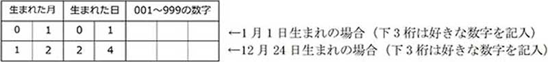 (1)受験者の生まれた月日を2桁の数字で記入してください。1桁の月日の場合は「0」を付けて2桁で記入してください。(2)001~999の好きな数字を記入してください。他の受験者と受験番号が重複しないよう、安易な番号作成は避けてください。なお、仮に受験番号が重複した場合は事務局よりご案内をさせて頂きます。