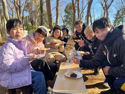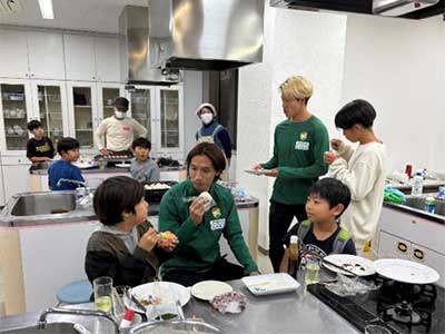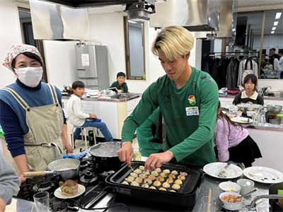 子どもたちと一緒におでんやたこ焼きを美味しくいただきました。椿選手はたこ焼きづくりにも挑戦。