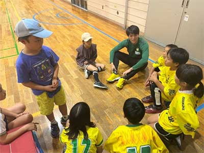 サッカー初心者チームと経験者チームに分かれて、一緒にボール遊びを実施。選手がポイントを伝えると、子どもたちはみるみる上達し、最後には思わず拍手が起こる“スーパーゴール”も飛び出しました。