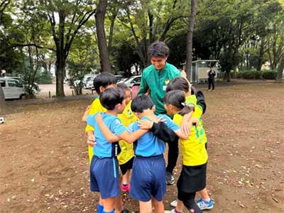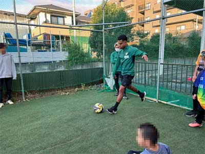 ボールの蹴り方を教えたり、一緒にボール回しをしたりしながら、サッカーが上手くなる方法について熱心に質問する姿が見られました。