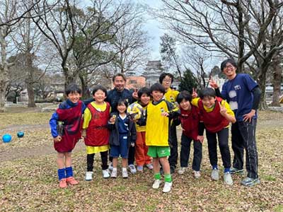 みんなでウォーミングアップからスタートし、ボールを使ったコーン当てゲームでは大盛り上がり。