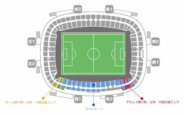 - 全席自由席となりますが、黄色の枠線で囲まれたエリアはホーム鳴り物・立見・大旗応援エリア、赤色の枠線で囲まれたエリアはアウェイ鳴り物・立見・大旗応援エリアとなります。
