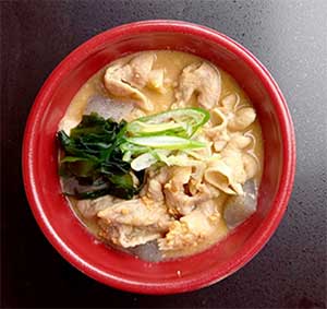 まるみつ旅館の代名詞!あん肝が溶け込んだ唯一無二の濃厚スープと、ぷりぷりのもつが絡み合う、リピーター続出の看板メニューです。