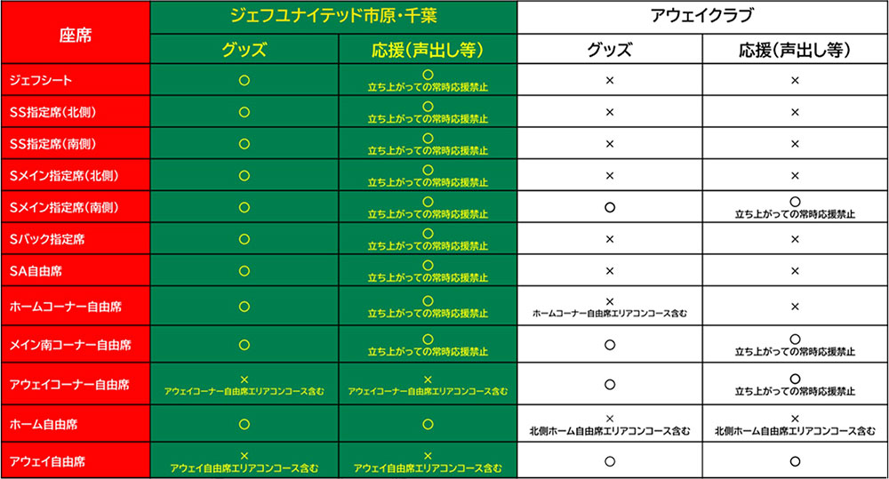 アウェイユニフォーム・グッズを着用しての通行・進入禁止とさせていただいているエリアにつきましては下記の表のとおりです。