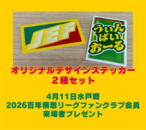 ジェフユナイテッド市原・千葉では、2026百年構想リーグファンクラブ会員さま限定で、明治安田J1百年構想リーグ第10節4月11日(土)水戸ホーリーホック戦に来場された方へプレゼントをお渡しします。今回はジェフならではのデザインに落とし込んだステッカー2種をプレゼントいたします。