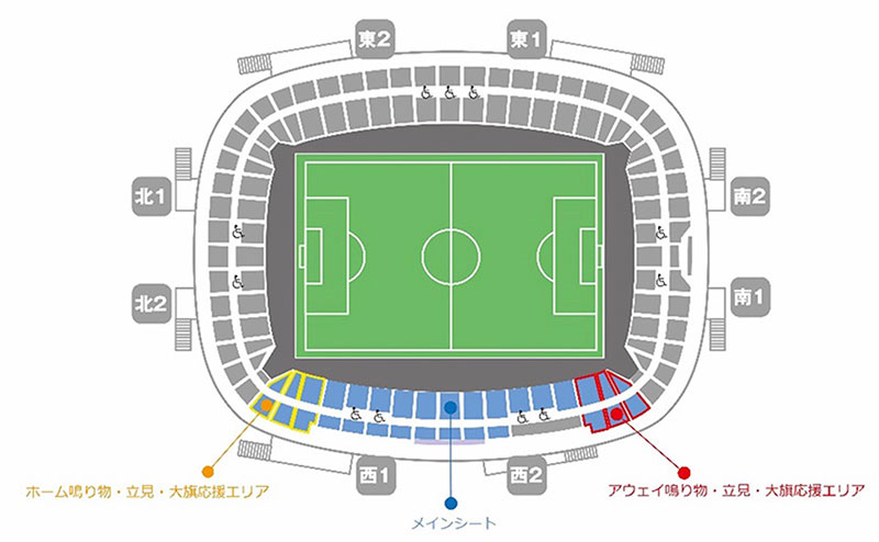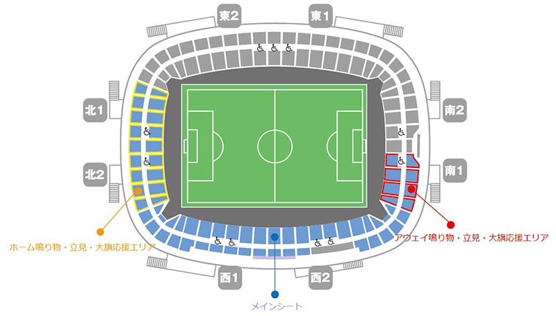 - 全席自由席となりますが、黄色の枠線で囲まれたエリアはホーム鳴り物・立見・大旗応援エリア、赤色の枠線で囲まれたエリアはアウェイ鳴り物・立見・大旗応援エリアとなります。