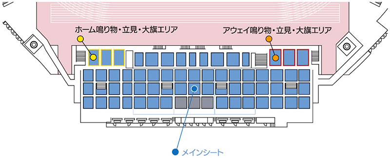 「鳴り物・立見・大旗応援エリア」をご希望のお客さまはメインシートをご購入いただき、スタジアム内にて上記エリアへご移動ください。 - ゲートについては変更となる場合がございますので、あらかじめご了承ください。