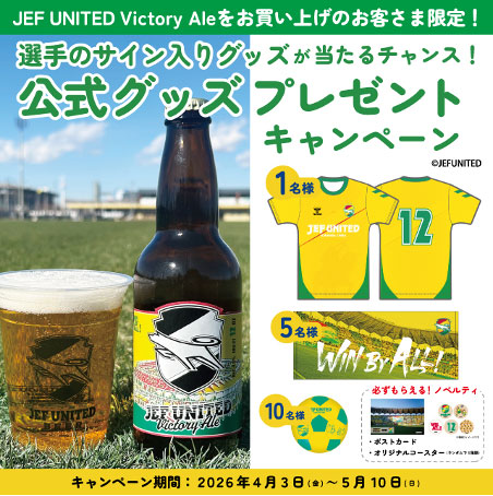 対象期間中、ペリエ公式オンラインストア「PERIE Online JRE MALL店」にて『JEF UNITED Victory Ale』6本セットをご注文いただいたお客さまの中から抽選で選手サイン入りグッズが総勢16名様に当たります。