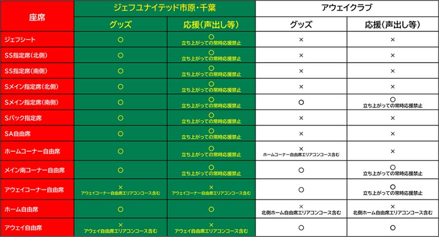 アウェイユニフォーム・グッズを着用しての通行・進入禁止とさせていただいているエリアにつきましては下記の表のとおりです。