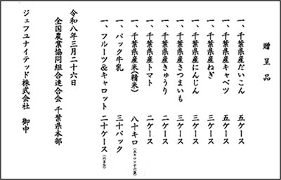 全国農業協同組合連合会 千葉県本部様 千葉県産農畜産物の受贈について