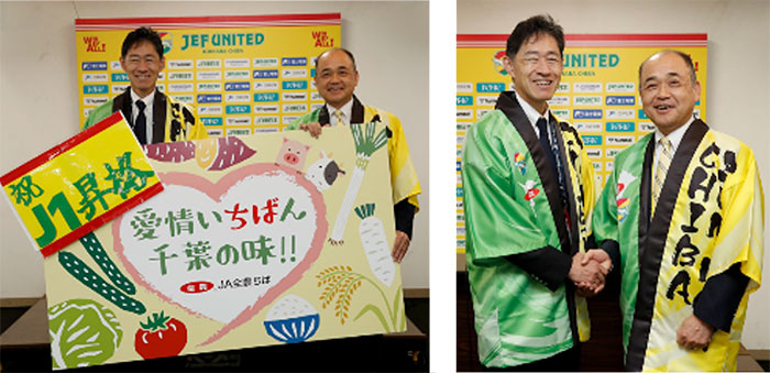 ジェフユナイテッド市原・千葉のアシストパートナーとして、選手の「食」をサポートいただいている全国農業協同組合連合会 千葉県本部様より、J1昇格のお祝いとして、千葉県産の農畜産物を受贈しました。