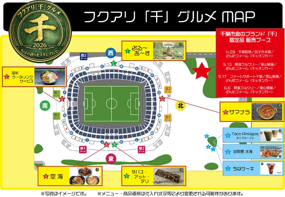 ジェフユナイテッド市原・千葉では、4月29日(水・祝)以降の明治安田J1百年構想リーグ4試合におきまして、「フクアリ『千』グルメ」と題し、千葉市の推進する「千葉市食のブランド『千』」の認定品及び認定品を使用したメニュー等をご提供する出店を行います。レギュラー店舗に置きましても、千葉県・千葉市の食材を使った ちば推し限定メニューを販売します。