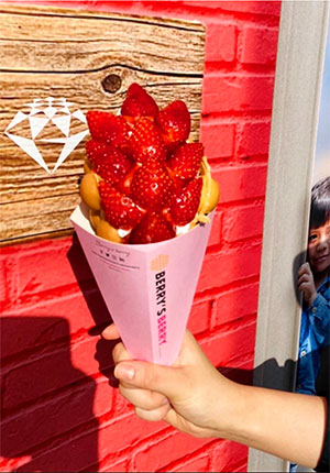 外はカリッと、中はもちもちとした食感のバブルワッフル生地に、甘さ控えめのクリームと自慢のとちおとめをたっぷりトッピングした一品です。