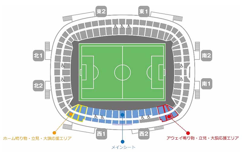 - 全席自由席となりますが、黄色の枠線で囲まれたエリアはホーム鳴り物・立見・大旗応援エリア、赤色の枠線で囲まれたエリアはアウェイ鳴り物・立見・大旗応援エリアとなります。