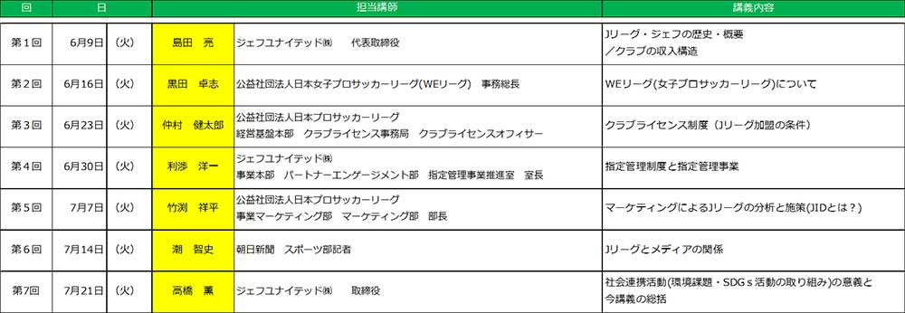 サッカーに関わる様々な専門ジャンルの方々をゲストティーチャーとして招き、それぞれの切り口からサッカーのマネージメント、地域との関わりについて授業を展開します。講師のスケジュールは変更になる場合がございます。(敬称略)