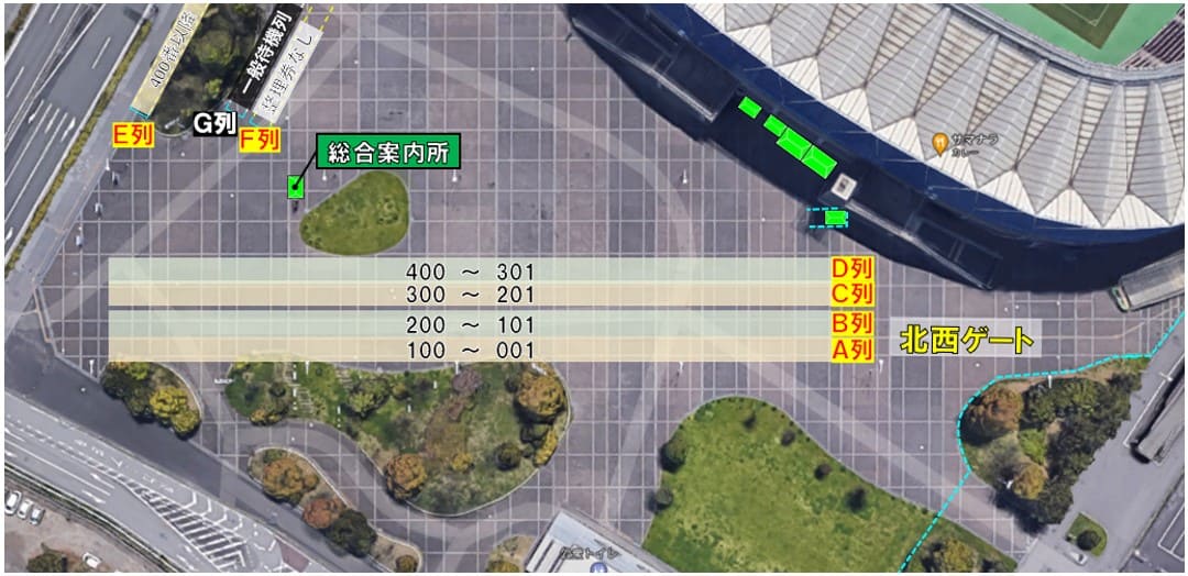 入場ゲートは「北西ゲート(指定席レーン・自由席レーン)」、「東2ゲート」、「南西ゲート」の3か所になります。